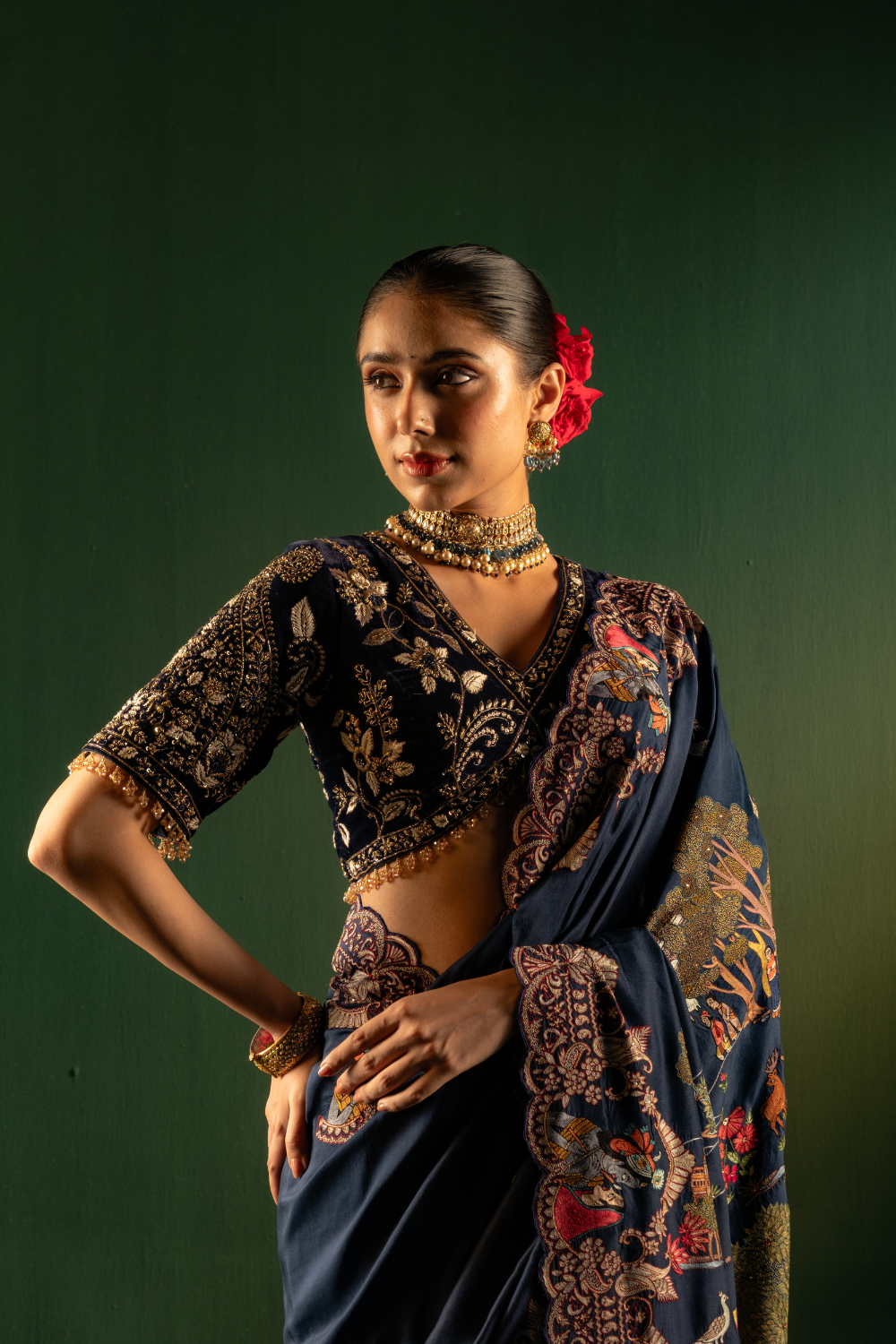 KRISHNA GOPALA SAREE WITH KALAMKAARI RESHAM THREAD HAND EMBROIDERYColour:- MIDNIGHT BLUE Fabric:- SILK