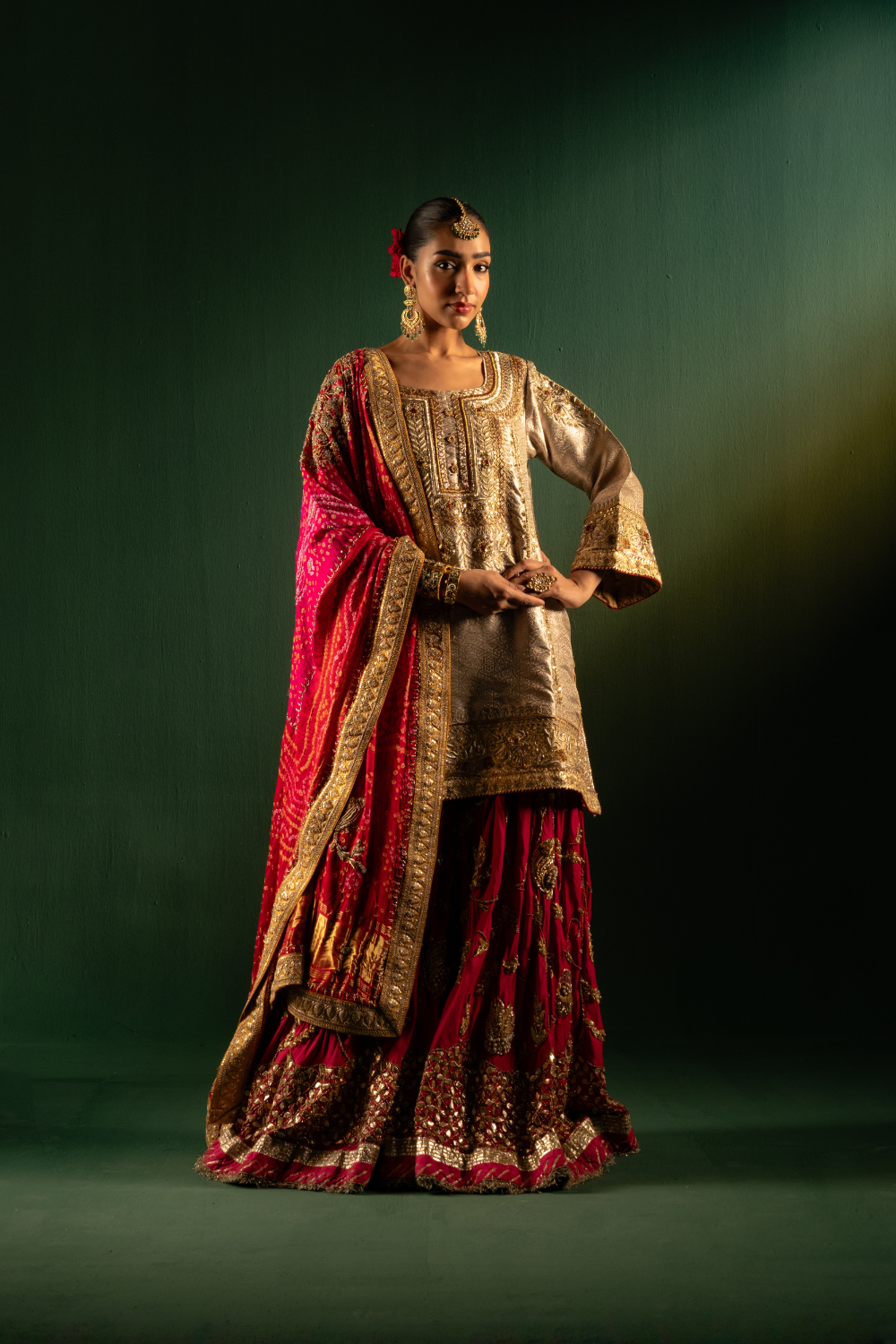 INTRICATELY EMBROIDERED ZARDOZI DABKA AND GOTA ON HAND WOVEN BANARSI LAME WITH BANDANI DUPATTAColour:- SHIRT- GOLD DUPATTA- PINK & RED SHARARA- REDFabric:- SHIRT- LAME BROCAID DUPATTA- GEORGETTE, SHARARA- UPADA SILK Components:- 3Delivery Time:- 30 Days